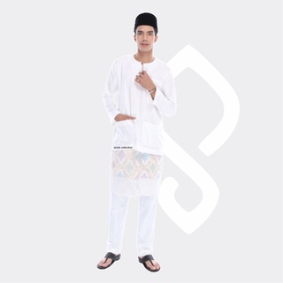 Baju koko pria melayu teluk belanga satin setelan muslim kurung putih.